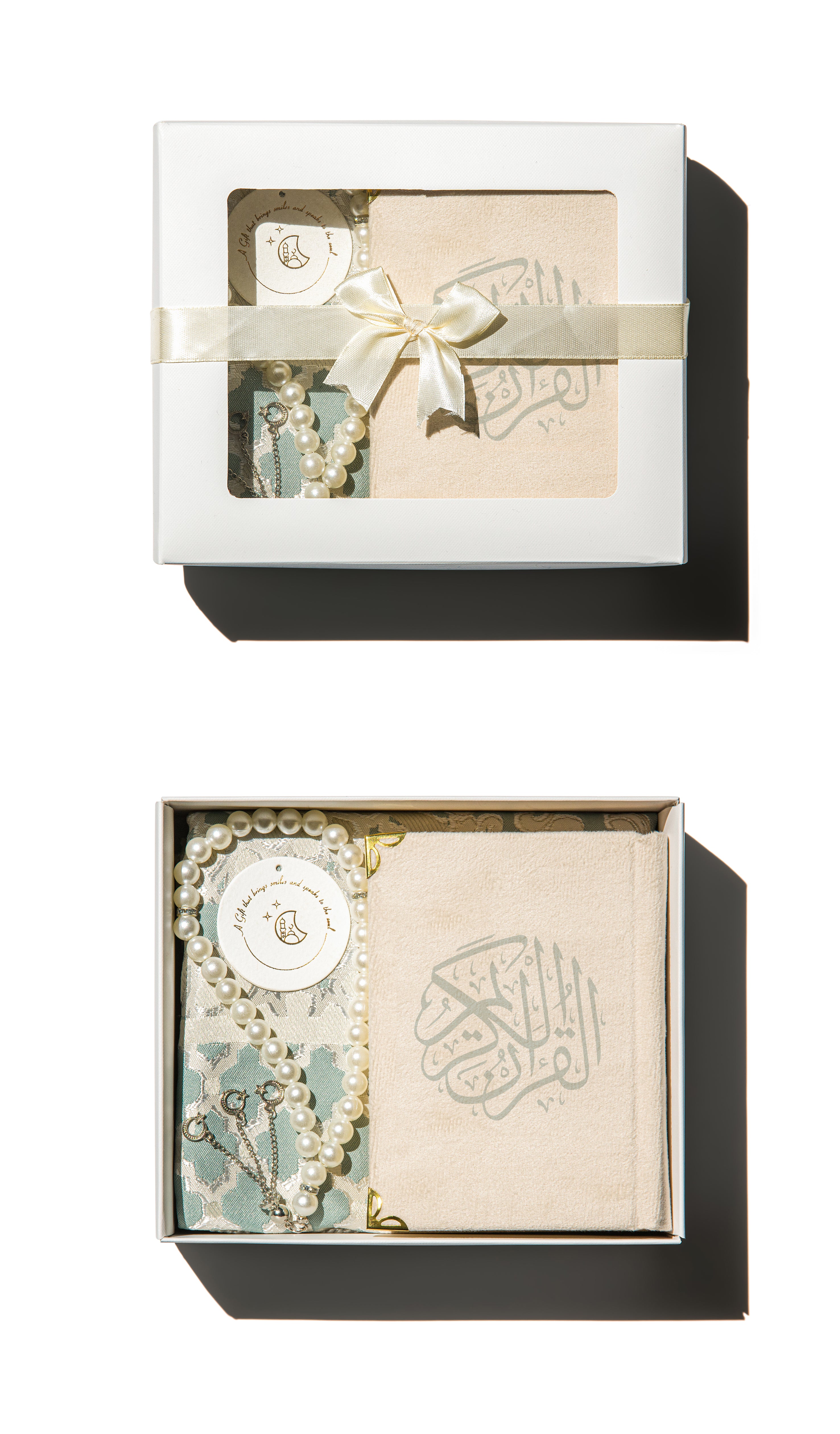 This Mint Green Prayer Mat & Qur’an Giveaway Box is a thoughtful set designed for comfort and spiritual reflection. It includes a soft, beige prayer mat and a beautifully bound Qur’an, making it a meaningful gift for friends, family, or other special people. Perfect for Ramadan, Eid, Hajj, Umrah, or any occasion, this set blends practicality with inspiration, encouraging moments of prayer and inner peace wherever it’s used. Minimal, elegant, and purposeful, it’s truly a gift that touches the heart.